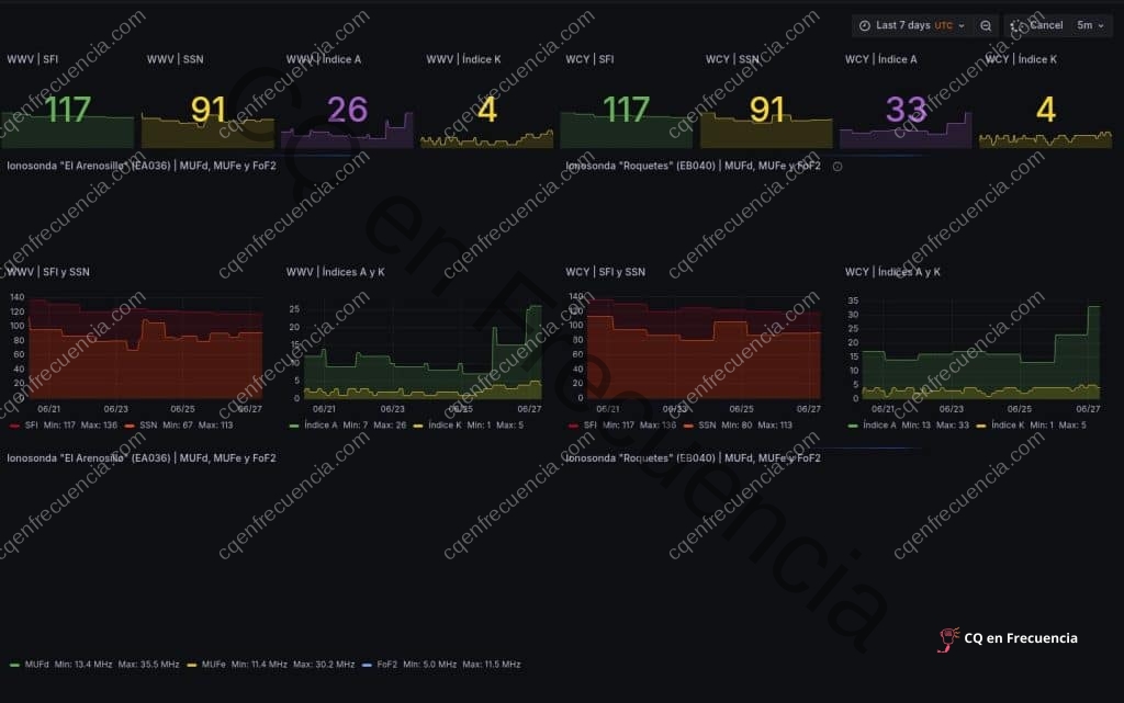 – Con un Índice K de 3, las condiciones en HF son regulares, pero aún se pueden aprovechar varias bandas efectivamente. – El SFI de 183 y un índice A por debajo de 50 sugieren buenas condiciones para la propagación en HF, gracias a una baja perturbación geomagnética. – Las diferencias entre las sondas ionosféricas muestran valores altos en la primera columna, indicando excelentes condiciones para la propagación en HF, y aunque la segunda columna es más baja, aún permite una propagación razonable.