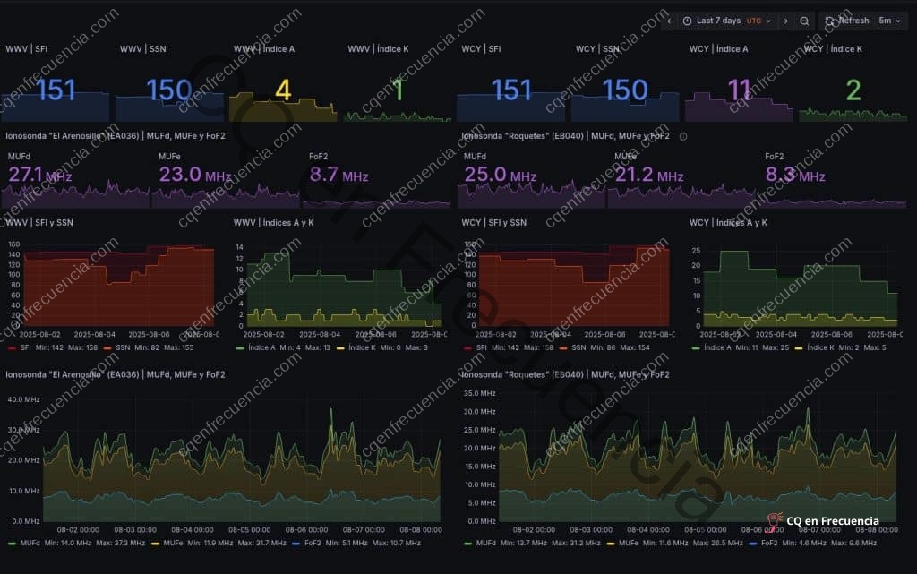 – El Índice K observado es de 3, indicando condiciones regulares en HF. Aunque no sean las ideales, aún se pueden aprovechar varias bandas de HF de manera efectiva. – El SFI registrado es de 183, un valor alto que favorece la propagación en HF. El índice A está por debajo del umbral crítico de 50, sugiriendo buenas condiciones para aprovechar el SFI alto. – Las sondas ionosféricas muestran diferencias significativas en sus datos. En general, se observan condiciones favorables para la propagación en HF, con valores altos en la primera columna y valores más bajos pero razonables en la segunda.